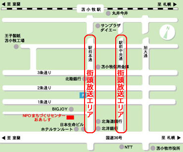 | おあしすでは、まちづくり活動の一環として、中心市街地にて街頭放送「G-air」を運営しています。そして、週1回「まちかどウォッチング」を絶賛生放送中! タウン情報やイベント情報の提供、苫小牧で活躍する人をゲストに招いたり、地元ミュージシャンの曲や校歌を紹介しています。お昼休みなどでちょっと街を歩いたときに耳を傾けてみてください。 |